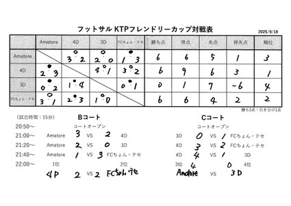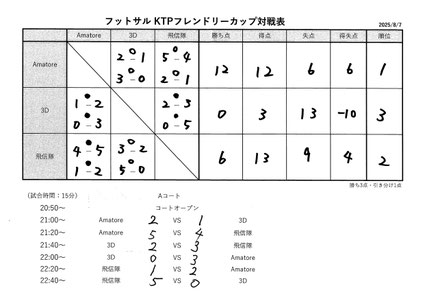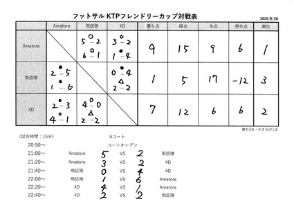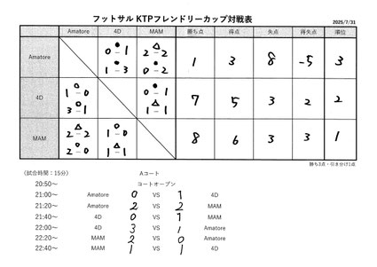 試合開始から4Dが攻め込みAmatoreが耐える展開が続く。しかし、ゴールスローから抜け出してゴールを決めたAmatoreが先制。その後も4Dがゴールに迫り続けるが、Amatoreが一瞬の隙をつきカウンターから追加点を決めて前半終了。後半も4Dが攻めてAmatoreが守る似たような展開になるが、4DはAmatoreのGKを中心とした守備をなかなか崩せない。決定機を作れず時間が過ぎていき残り5分またもやカウンターからAmatoreが追加点。Amatoreが3対0で勝利しました。